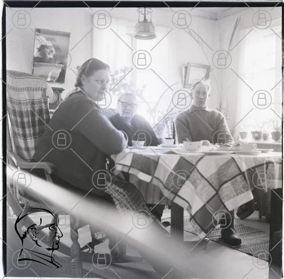 svartvit, inomhus, familj, fika, bord, stolar, växter, duk, te, kaffe, människor, gammaldags, hem, samvaro, ljus, tradition, retro, kläder, samtal, gemenskap, hemtrevligt, interiör, fotografi, nostalgi, 1900-tal, svensk kultur