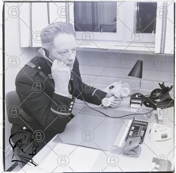 man, telefon, kontor, skrivbord, lampor, dokument, uniform, svartvitt, 1960-tal, kommunikation, arbete, telefonlur, pappersark, kontorsutrustning, fönster, stolar, skrivmaskin, anteckningar, professionell, vintage