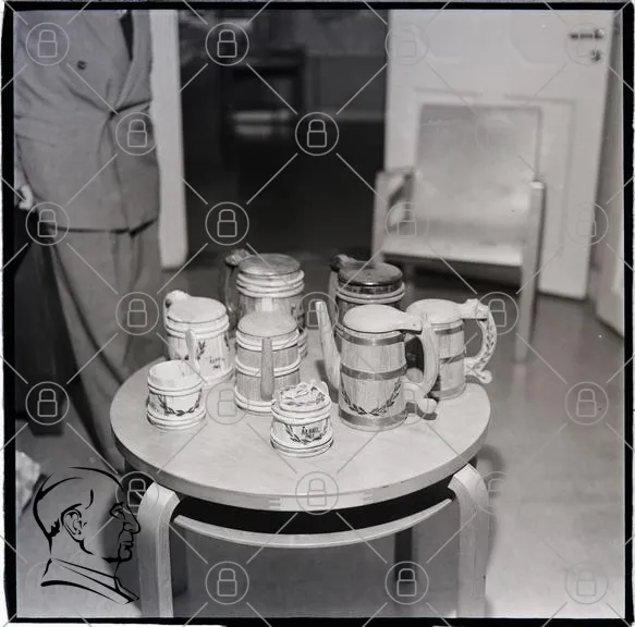kanna, muggar, porslin, bord, inredning, vintage, kök, dryck, keramiska, dekoration, stil, 1900-tal, samling, hantverk, handgjord, design, retro, glasyr, färger, detaljer, traditionell, föremål, hem, atmosfär, stilren, klassisk, möbler, rum, svartvit