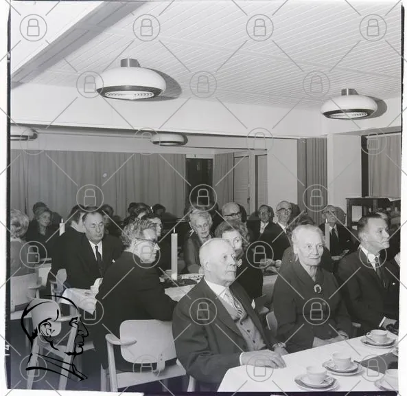 svartvit, gammal, fest, människor, bord, stolar, kläder, samling, ljus, dukning, samtal, evenemang, 1960-tal, inomhus, sällskap, tradition, middag, dekoration, ansikten, uttryck, socialt, gemenskap, äldre, stil, atmosfär, kultur, minnen, historia, festligheter