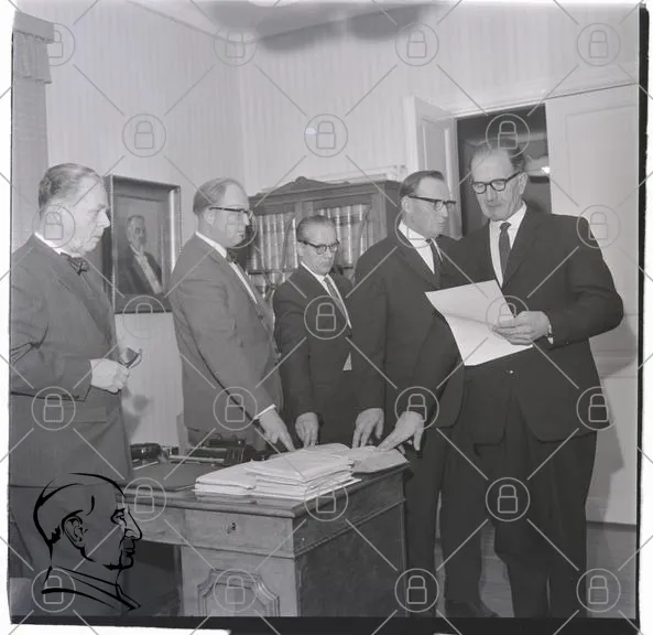 historisk, svartvit, möte, kontor, dokument, män, kläder, 1960-tal, skrivbord, porträtt, papper, glasögon, diskussion, affärsmän, inomhus, formell, samarbete, ledarskap, presentation, fotografi, arkiv, professionell, stil, traditionell, interiör, grupp, affärsmöte, kommunikation, affärsrelationer