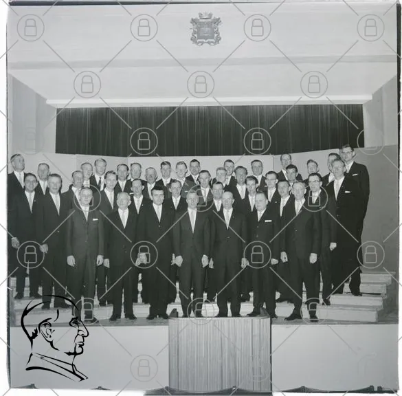 grupp, män, kostymer, svartvitt, scen, formell, klädsel, porträtt, samling, 1960-tal, stil, tradition, evenemang, bakgrund, leenden, fotografering, högtidlig, presentation, organisation, gemenskap, mänsklig, samarbete, kultur, historia, fest, ceremoni, utseende, professionell, artighet, sammanslutning, representation