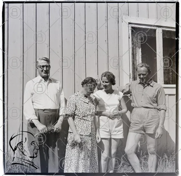fyra personer, trävägg, fönster, sommarkläder, man, kvinna, gräs, utomhus, soligt, familj, gruppfoto, shorts, klänning, skjorta, leende, avslappnad, retro, svartvitt, gammaldags, 1900-tal
