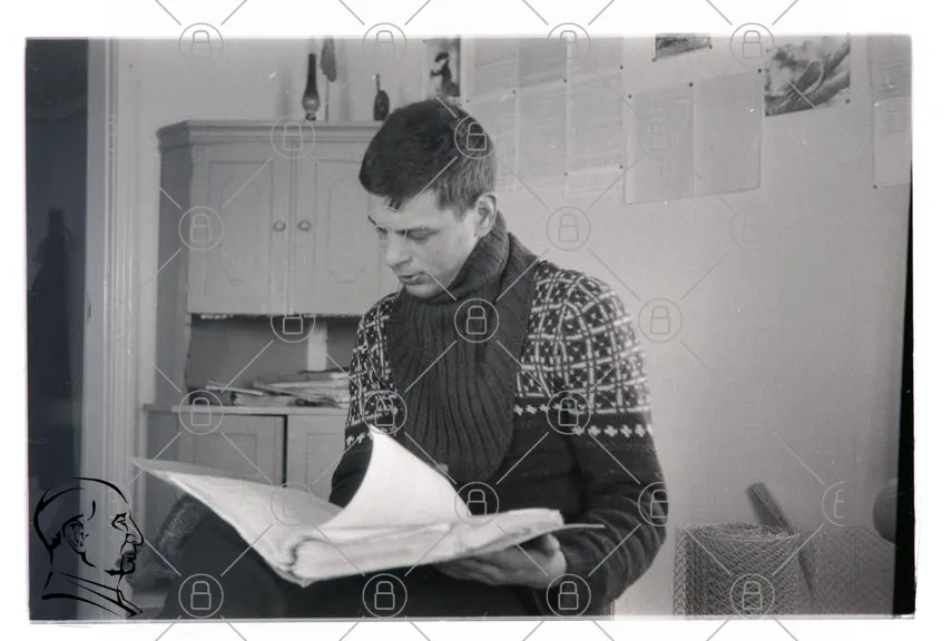 man, läsande, dokument, svartvitt, inomhus, tröja, mönster, kontor, möbler, papper, fokus, 1960-tal, studier, koncentration, skrivbord, interiör, vintage, ungdom, stillhet, kreativitet, arbete, bok, tidning, anteckningar, skandinavisk, retro, stil, avslappnad, intellektuell, miljö