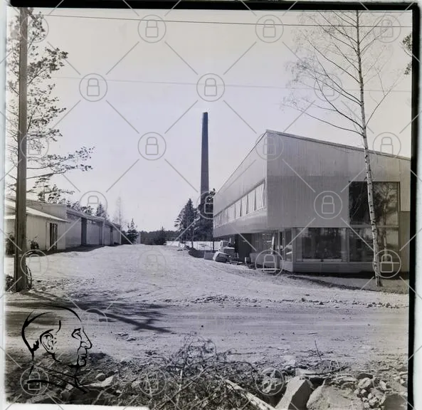 industri, byggnader, fabrik, skorsten, träd, väg, grus, 1900-tal, landskap, arkitektur, svartvit, historia, Sverige, modern, kontor, industriområde, natur, miljö, byggnadsstil, landsbygden, fototeknik