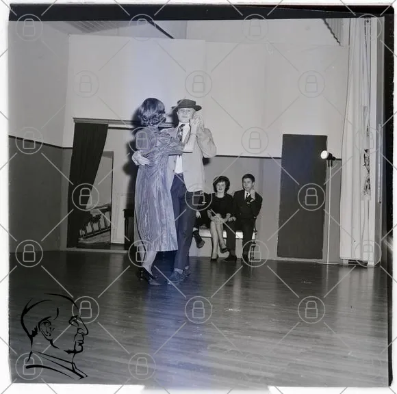 dans, par, kvinna, man, kläder, hatt, scen, publik, 1950-tal, svartvitt, dansgolv, underhållning, föreställning, stil, retro, socialt, evenemang, glädje, rörelse, musik, danspartner, uttryck, samspel, tradition, kultur, fest, minnen, nostalgisk, konst, aktivitet