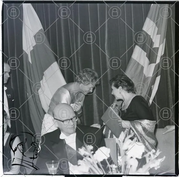 fest, gala, klänningar, flaggor, kvinnor, män, 1960-tal, svartvitt, eleganta, mingel, blommor, sällskap, ceremonin, diplomati, socialt, evenemang, stil, tradition, kultur, samling, skratt, samtal, kläder, festligheter, artighet, uppvaktning, fotografering, minnen, historia, feststämning