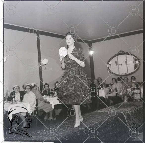modell, mode, catwalk, 1950-tal, klänning, publik, restaurang, svartvitt, modevisning, frisyr, smycken, stil, vintage, fotografering, socialt, evenemang, kvinnor, skönhet, glamour, fest, belysning, spegel, bord, mat, dryck, kläder, underhållning, tradition, kultur, historia
