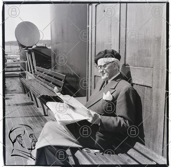 man, läser, tidning, bänk, utomhus, sol, hatt, glasögon, kostym, ficknäsduk, skugga, träbänk, däck, fartyg, antenn, svartvitt, äldre man, avslappnad, soligt, sjö, bakgrund, kläder, mode, 1900-tal, klassisk, stil