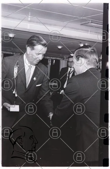 svartvit, bild, män, prisutdelning, ceremon, kostymer, kontor, 1960-tal, affärsmän, trophy, handskakning, möte, inomhus, formal, kläder, stil, professionell, representation, samarbete, historia