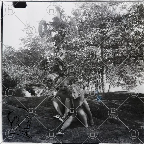 barn, sommar, lek, natur, klippa, träd, bad, glädje, syskon, svartvitt, utomhus, vatten, skratt, sol, barndom, minnen, frihet, lekfullhet, vänskap, sommarsemester