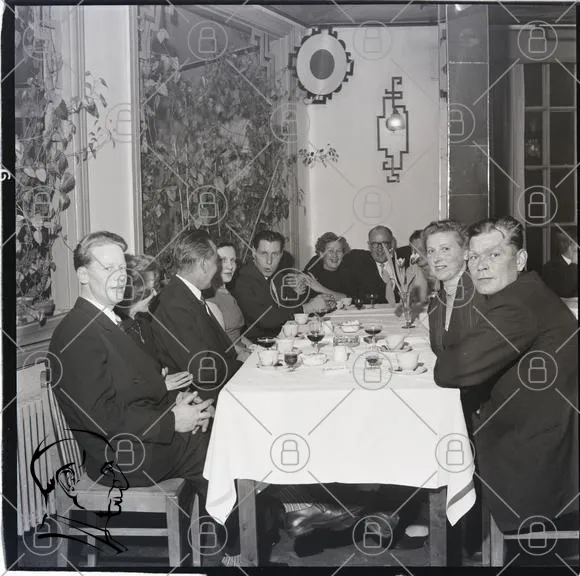 middag, restaurang, 1950-tal, klädda, sällskap, bord, glas, mat, växter, svartvitt, män, kvinnor, samtal, fest, eleganta, stolar, dukat, leenden, socialt, samvaro, tradition, interiör, belysning, kultur, stil, gemenskap, nostalgisk, historisk, fotografi, retro
