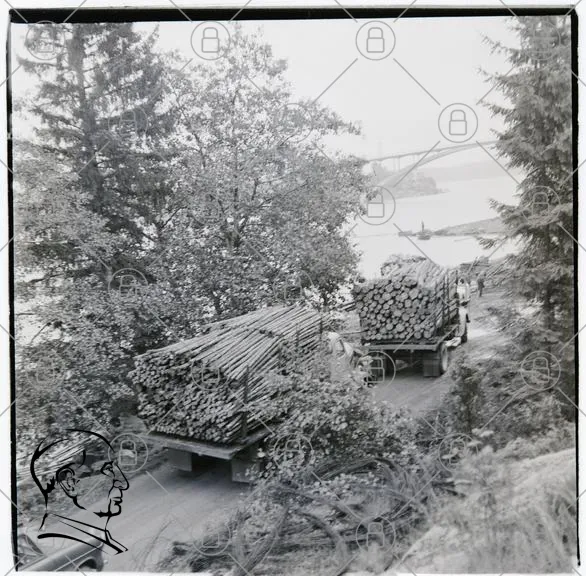 lastbilar, timmer, skog, flod, bro, transport, natur, träd, landskap, väg, last, trä, industri, miljö, fordon, avverkning, landsbygden, trästockar, grönska, foton, svartvitt, historisk, arbete, skogsbruk, lastning, lastplats, träprodukter, skogsindustri, landskapsbild, vägtransport, skogsarbete