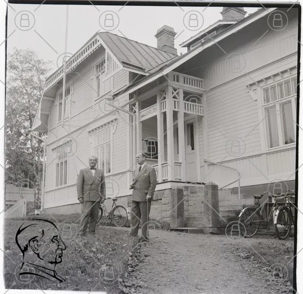 två män, hus, cyklar, gräsmatta, träd, flaggstång, entré, kostymer, svartvitt, byggnad, arkitektur, utomhus, landskap, 1900-tal, stil, fotografering, promenad, väg, fönster, dörr, trappa, gård, natur, historia, tradition, samhälle, kultur, miljö, detaljer, design, perspektiv