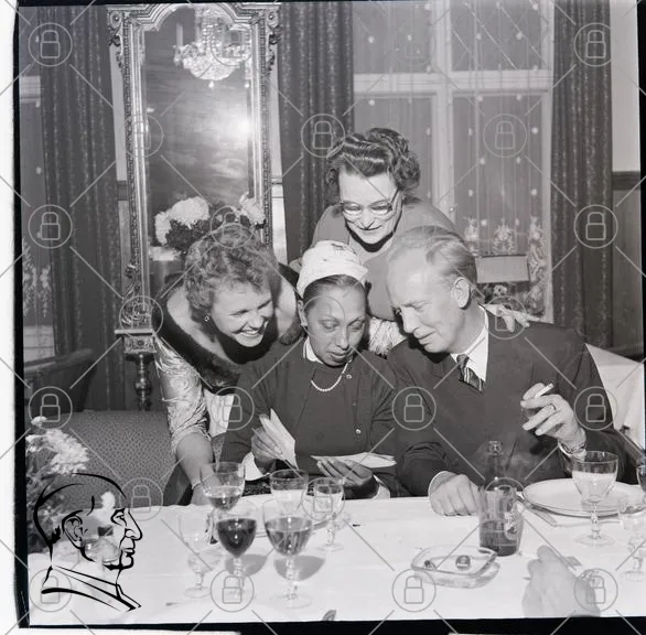 middag, fest, kvinnor, män, kläder, glas, bord, dekoration, leende, samtal, 1950-tal, svartvitt, socialt, samvaro, mat, dryck, eleganta, interiör, fotografi, historiskt, nöje, gemenskap, skratt, uppvaktning, tradition, kultur, stil, vänskap, glädje, minnen
