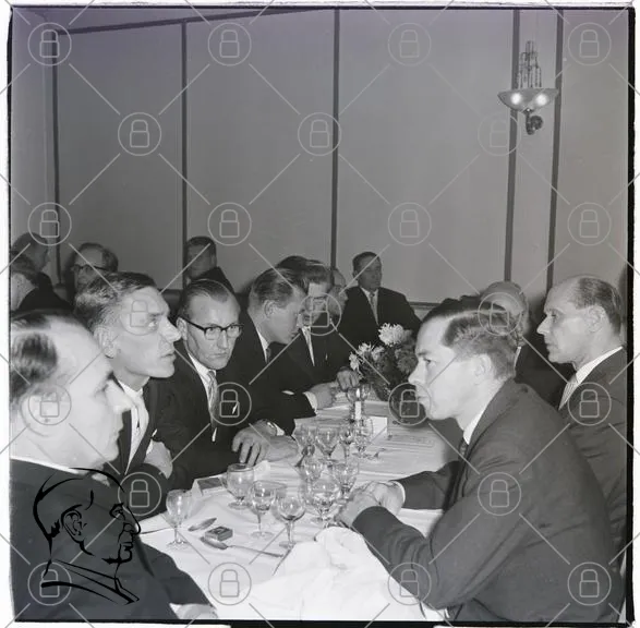 middag, män, diskussion, bord, glas, servetter, kostymer, blommor, formell, möte, 1950-tal, svartvitt, restaurang, samtal, affärsmän, professionell, samarbete, nätverkande, socialt, evenemang