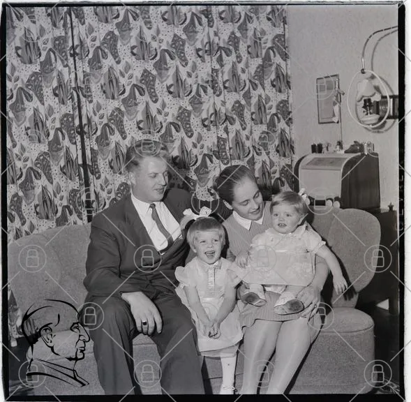 familj, barn, soffa, leende, 1950-tal, inredning, kläder, föräldrar, syskon, fotografi, svartvitt, hem, interiör, glädje, tradition, vintage, porträtt, barnkläder, familjebild, kärlek, nostalgi, hemmet, familjemedlemmar, skratt, samvaro, minnen, familjefotografi, barnens glädje, familjesammanhållning, hemkänsla