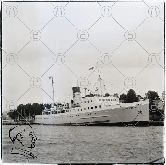 fartyg, båt, sjöfart, hav, kaj, hamn, Klandsfärjan, vatten, segel, flaggor, trä, byggnad, landskap, svartvitt, transport, historia, resor, turism, skärgård, Sverige, 1900-tal, passagerare, ångbåt, marina, båtliv, kust, sjö, natur, kultur
