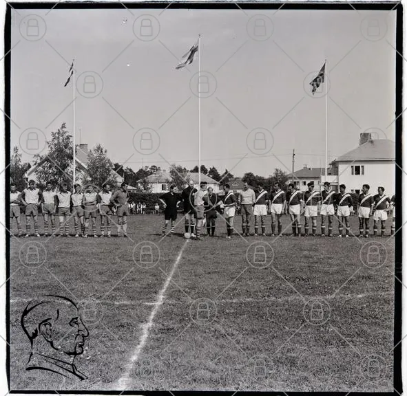 fotboll, lag, spelare, domare, fotbollsplan, flaggor, uniformer, match, gräs, sport, utomhus, linje, hus, träd, publik, himmel, ceremoni, uppställning, idrott, tävling