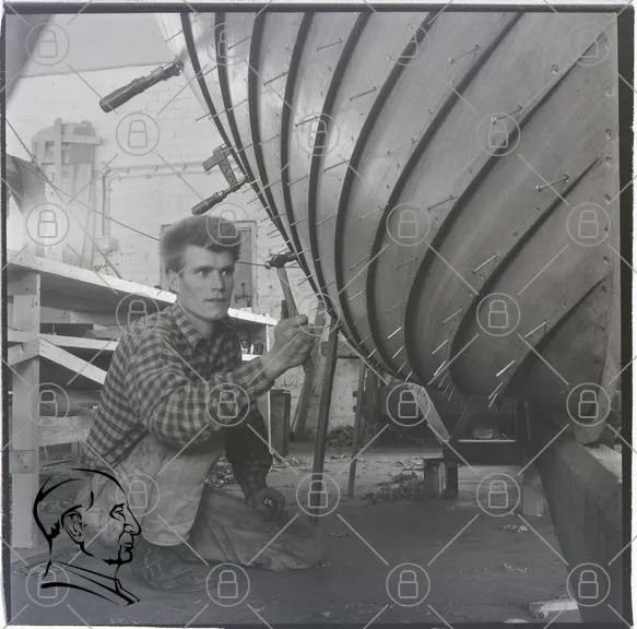 båt, byggande, hantverk, man, verkstad, trä, arbete, verktyg, snickare, 1900-tal, svartvit, hantverkare, båtbyggeri, detaljer, konstruktion, traditionellt, industri, yrke, noggrannhet, hantverkskonst