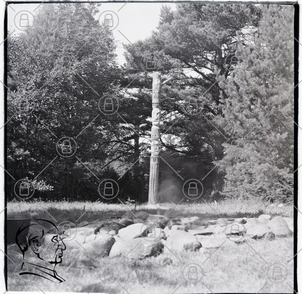 totempåle, stenar, skog, träd, gräs, utomhus, natur, svartvitt, gammal, traditionell, kultur, konst, skulptur, landskap, historisk