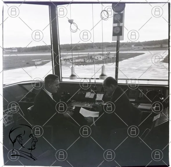 flygplats, kontrolltorn, män, samtal, flygplan, fönster, teknik, kommunikation, trafikledning, säkerhet, 1960-tal, professionell, arbetsmiljö, dokument, observation, utsikt, luftfart, kontor, instrument, signaler, belysning, infrastruktur, flygning, flygoperatörer, historisk, svartvit, samarbete, planering, övervakning
