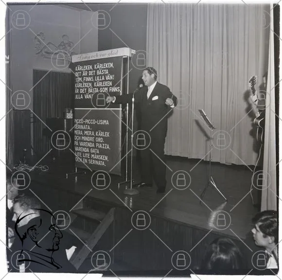 kärleken, bästa, kalas, scen, man, mikrofon, gitarr, publik, föreställning, text, svartvitt, underhållning, 1950-tal, kläder, tal, musik, show, artist, stående, skådespelare, ljus, bakgrund, scenografi, presentation, ord, seminar, humor, tradition, kultur, minnen