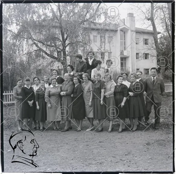 grupp, kvinnor, klänningar, 1950-tal, svartvitt, utomhus, träd, byggnad, fotografering, leende, traditionell, mode, stil, samling, porträtt, skola, gemenskap, vänner, familj, historia, nostalgi
