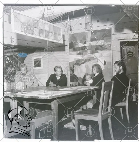 inomhus, möte, konst, människor, barn, bord, stolar, väggar, tavlor, svartvitt, 1900-tal, kreativitet, diskussion, grupp, interiör, konstverk, skandinavisk, tradition, kultur, fotografi, konstnärer, samarbete, hantverk, design, ateljé, familj, gemenskap, historia, retro