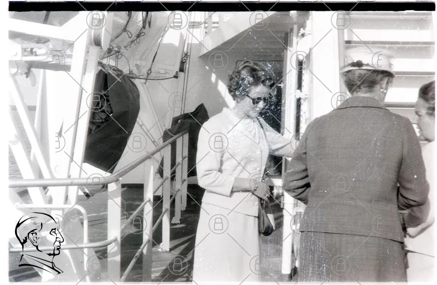 svartvitt, kvinna, solglasögon, båt, kläder, 1960-tal, stil, interiör, passagerare, skepp, trappa, mode, retro, resande, hav, sjöfart, elegant, samtal, miljö, detaljer, fotografi