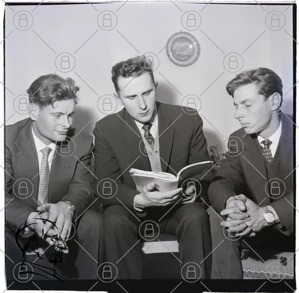 tre män, läsande, bok, svartvitt, kläder, sittande, inomhus, 1950-tal, diskussion, intresse, koncentration, ansiktsuttryck, stil, vintage, fotografi, social interaktion, vänner, samtal, kultur, historia, tradition, gemenskap, lärande, utbildning, tidsepok, nostalgi, uttryck, kroppsspråk, fokus, samarbete