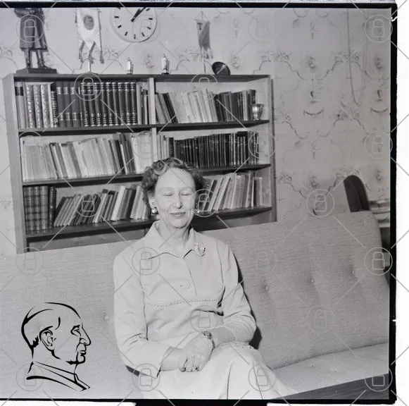 kvinna, soffa, bokhylla, böcker, klocka, inredning, svartvitt, vintage, 1900-tal, kläder, smycken, porträtt, hem, vägg, dekoration, stil, ansiktsuttryck, sittande, rum, familj, historia, gammal, tid, kultur, fotografi, person, interiör, klassisk, elegant, traditionell