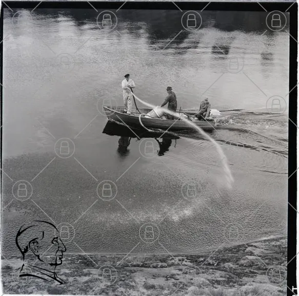 fiske, båt, män, nät, vatten, sjö, fiskeutrustning, fiskeverksamhet, natur, aktivitet, tradition, svartvitt, sommar, fritid, landskap, fångst, roddbåt, fiskeplats, teamwork, sportfiske