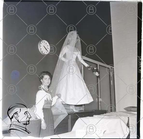 brud, brudklänning, brudslöja, bröllop, kvinna, blommor, tid, klocka, inredning, svartvitt, fest, tradition, klänning, bord, dekoration, fotografi, 1900-tal, stil, mode, festlighet, ceremoni