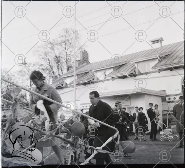 människor, kläder, svartvitt, TULL, byggnader, gator, fest, dekorationer, ballonger, fotografering, 1960-tal, promenad, socialt, samling, stil, historisk, utomhus, evenemang, tradition, kultur, män, kvinnor, barn, trappa, ansikten, aktiviteter, resande, transport, miljö