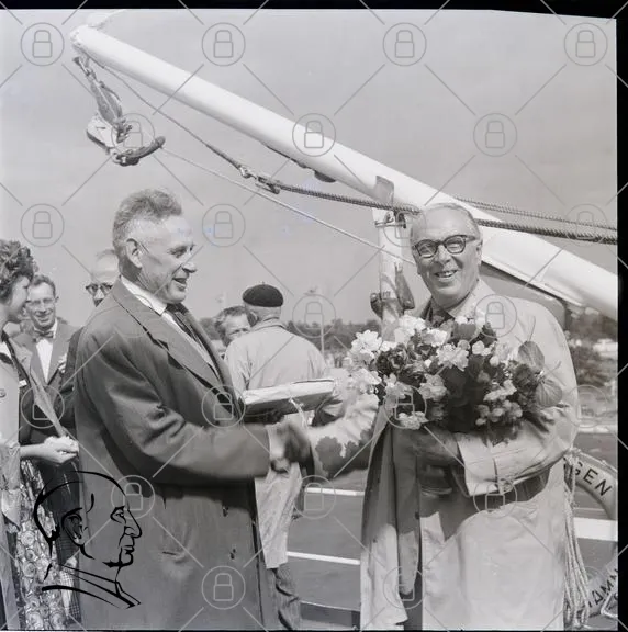 handshake, blommor, män, kostymer, 1950-tal, båt, hamn, välkomnande, festligheter, svartvitt, fotografering, socialt, evenemang, kläder, leenden, tradition, möte, gester, glädje, samarbete, historia, kultur, gemenskap, resande, utbyte, diplomati, vänskap, firande, offentlig, ceremoni