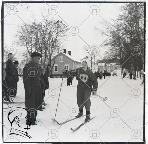 skidåkning, tävling, vinter, snö, nummerlapp, åskådare, träd, hus, landskap, sport, utomhus, skidspår, mössa, jacka, stavar, skidor, svartvitt, gammaldags, fotografi, man, kvinna, publik, vinterkläder, tävlingsdeltagare, nummer 64, vinterlandskap, skidåkare, vinteraktivitet, snötäckt, by