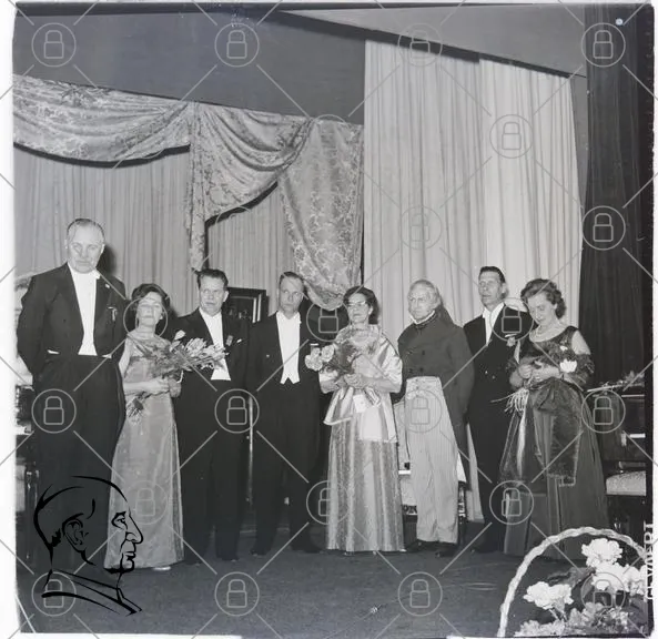 fest, gala, klänningar, kostymer, blommor, scen, utmärkelser, 1950-tal, svartvitt, elegans, artister, publik, föreställning, samling, porträtt, tradition, kultur, stil, minnen, evenemang, fotografering, festligheter, klädsel, smycken, leenden, glädje, samarbete, presentation, historia