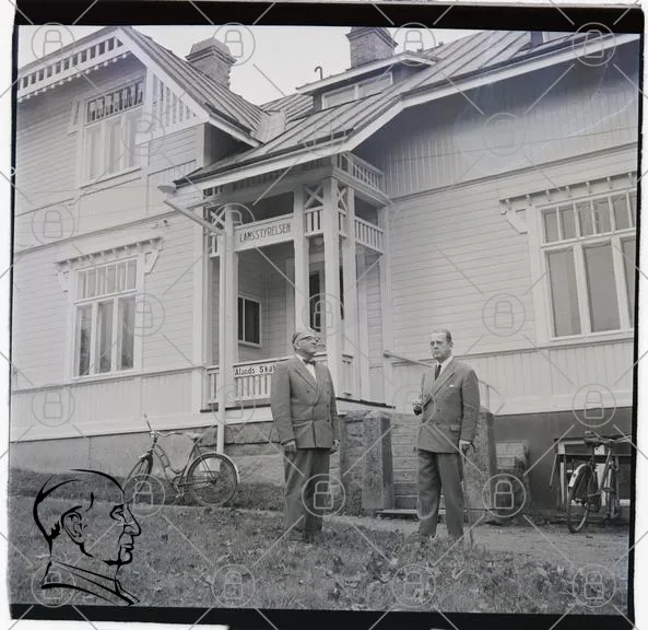 hus, byggnad, två män, cykel, trädgård, gräs, svartvitt, 1900-tal, arkitektur, entré, fönster, dörr, kostymer, landsbygd, svensk, stil, historia, fotografi, utomhus, landskap, gammal, traditionell, kultur, samhälle, Länsstyrelsen, män, stående, porträtt, vintage