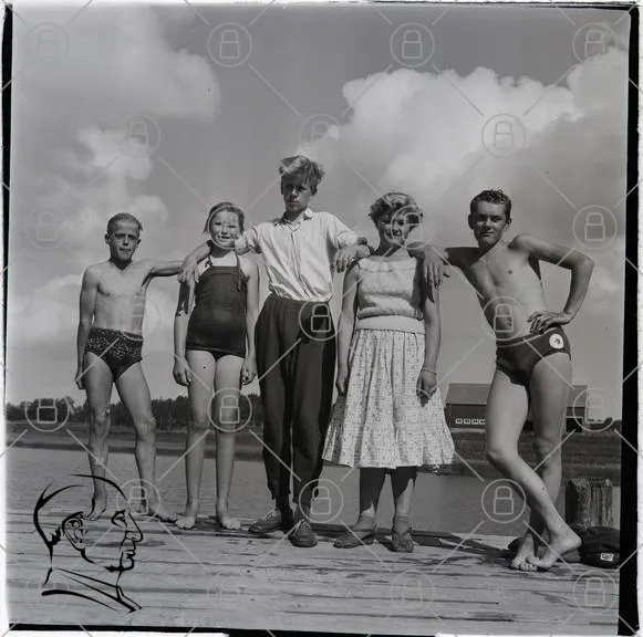barn, simning, sommar, brygga, kläder, badkläder, pojkar, flickor, svartvitt, fotografi, natur, himmel, vatten, leende, 1950-tal, ungdomar, familj, vänskap, fritid, glädje