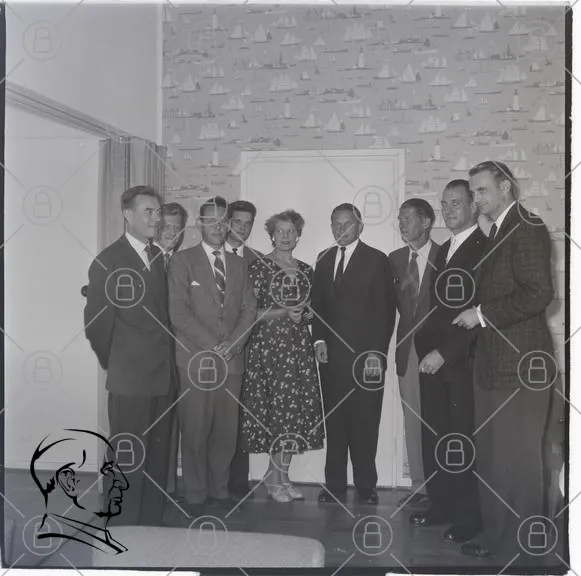 grupp, människor, svartvitt, kläder, 1950-tal, inomhus, möte, vägg, tapet, segelbåtar, kostymer, kvinna, man, fotografi, historiskt, samling, ansikten, stil, tradition, interiör, socialt, samarbete, diskussion, formalitet, tidsepok, porträtt