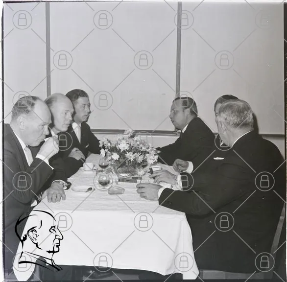 middag, affärsmöte, män, kostymer, bord, blommor, glas, mat, samtal, svartvitt, formell, restaurang, diskussion, kläder, duk, professionell, socialt, samvaro, 1900-tal, elegans, tradition, stil, högtidlig, samling, interaktion, atmosfär, affärsrelationer, nätverkande, representation, kultur