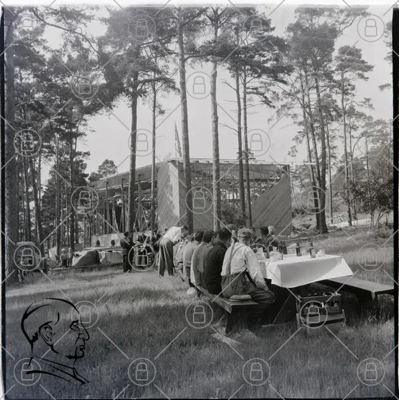fest, människor, mat, bord, träd, utomhus, samling, byggnad, vintage, 1900-tal, kläder, picknick, natur, samvaro, evenemang, gammal, tradition, landskap, bilar, stolar, duk, glas, tallrikar, festligheter, skog, fotografering, kultur, historia, gemenskap, nöje