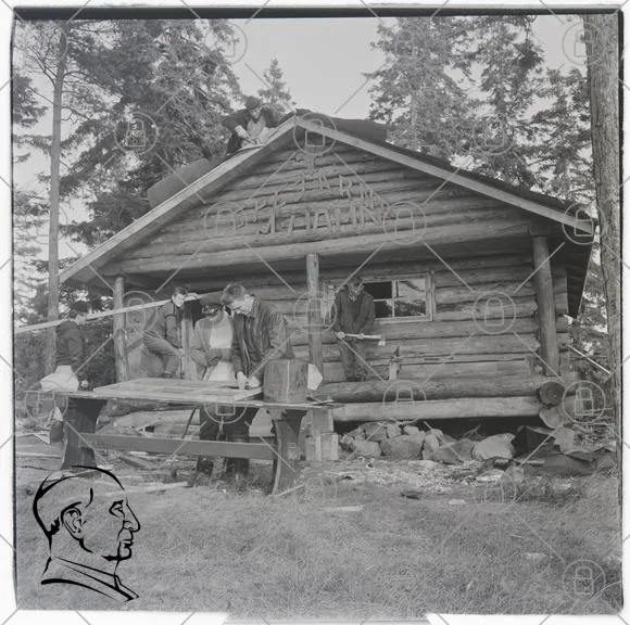 stuga, skog, trä, byggnad, människor, arbete, verktyg, natur, utomhus, hantverk, landskap, gammal, traditionell, samarbete, bänk, tak, fönster, sten, miljö, rustik, sommar, träarbete, fotografering, historia, avkoppling, friluftsliv, camping, renovering, projekt
