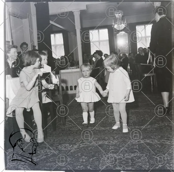barn, hand i hand, fest, inomhus, klänningar, stolar, publik, matbord, 1950-tal, svartvitt, leende, flickor, rum, ljuskrona, socialt, samling, kläder, barndom, glädje, tradition, evenemang, familj, sällskap, fotografering, minnen, lek, interiör, skratt, gemenskap, stil