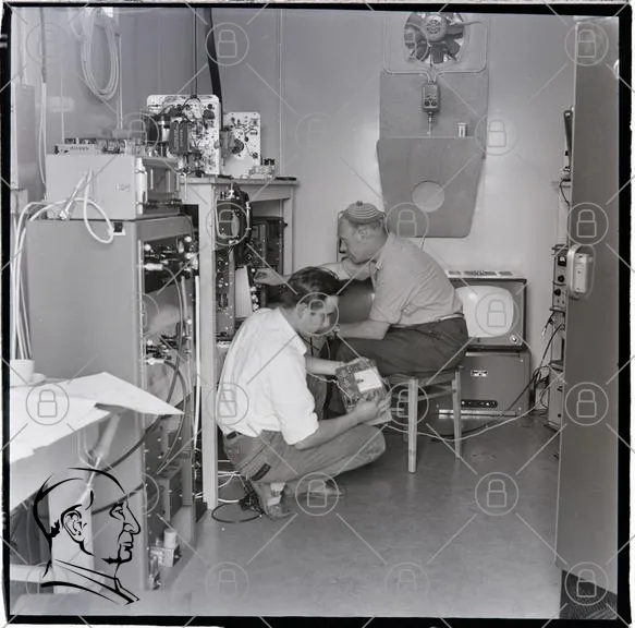 teknik, elektronik, reparation, två personer, verkstad, gammal TV, maskiner, kablar, stolar, arbete, laboratoriemiljö, svartvitt, utrustning, kretskort, hantverk, industri, forskning, experiment, verktyg, komponenter, skärm, monitor, kontor, teknikrum, 1960-tal, retro, ingenjör, teknikarbete, samarbete, professionellt