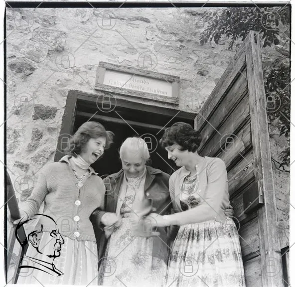 tre kvinnor, dörr, byggnad, sten, kläder, leende, svartvitt, gammal, interaktion, traditionell, utomhus, vänskap, kultur, historia, porträtt, samhörighet, glädje, besök, samhälle, generationer