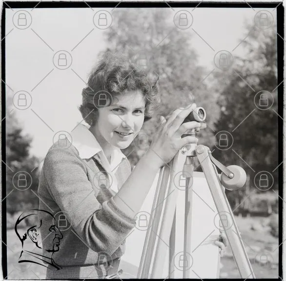 tjej, teodolit, mätinstrument, natur, träd, svartvitt, 1900-tal, vetenskap, teknik, ungdom, leende, kläder, utbildning, utomhus, fotografering, historia, forskning, precision, observation, geometri, ingenjör, astronomi, mätning, experiment, ungdomlig, intellektuell, nyfikenhet, tradition, klassisk, porträtt