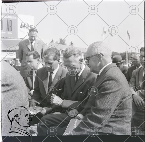 svartvit, män, kostymer, möte, 1950-tal, publik, flaggor, sittande, ansikten, dokument, historisk, evenemang, samling, kläder, stil, fotografering, utomhus, tradition, socialt, diskussion, uttryck, samarbete, gemenskap, minnen, nostalgi, kultur, samhälle, representation, tidsepok, aktivitet