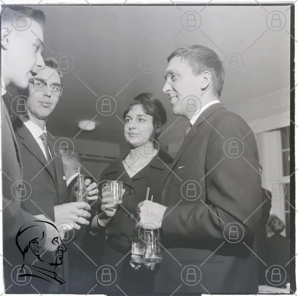 fest, människor, kläder, glas, drinkar, samtal, svartvitt, inomhus, socialt, 1960-tal, stil, leenden, interaktion, eleganta, ungdomar, vänner, samling, nätverkande, uttryck, ögonkontakt, festligheter, sällskap, mode, gemenskap, atmosfär, nostalgisk, vintage, porträtt, grupp, mingel